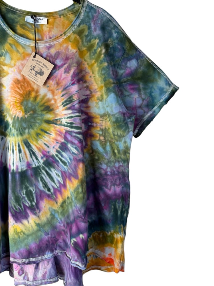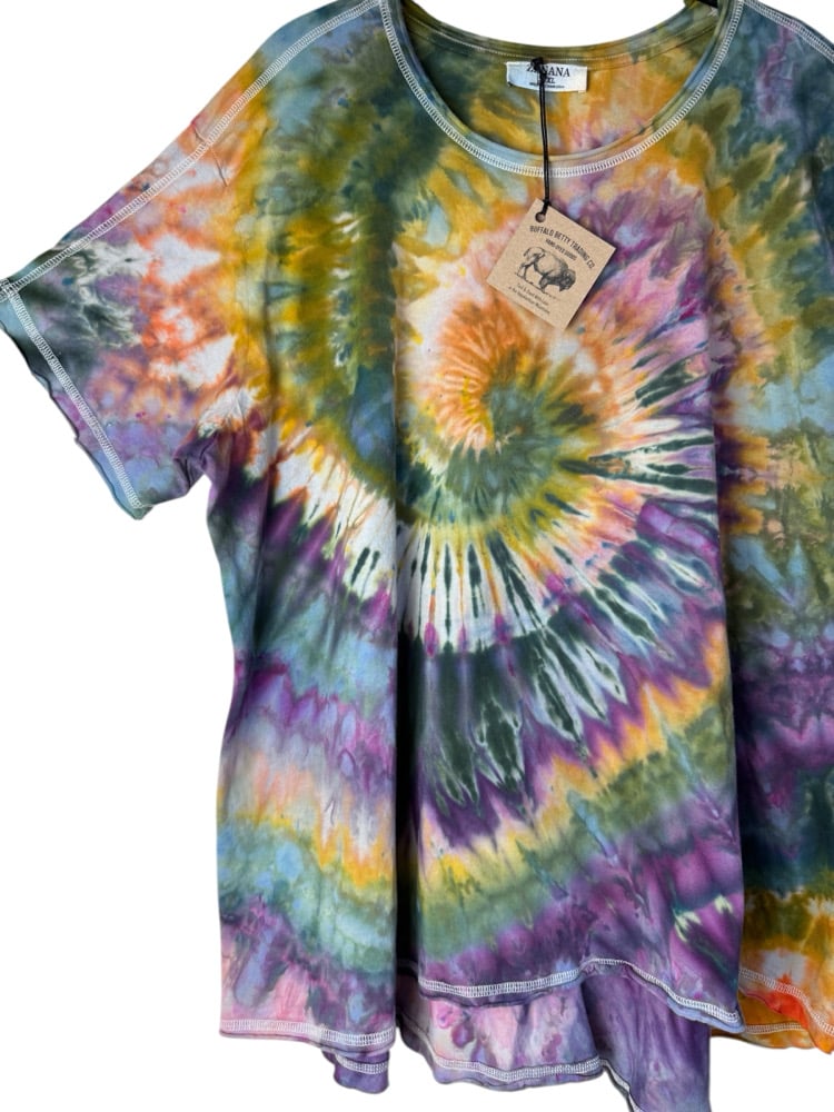 Each Buffalo Betty Trading Co. piece is completely one-of-a-kind. I dye everything by hand in small batches in my tiny home studio in the heart of the Appalachian Mountains. I mix the colors I use by hand and often create unique custom colors that can’t be reproduced. I utilize both traditional and modern methods and tie-dye techniques such as shibori and rain-dyeing