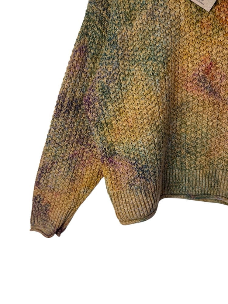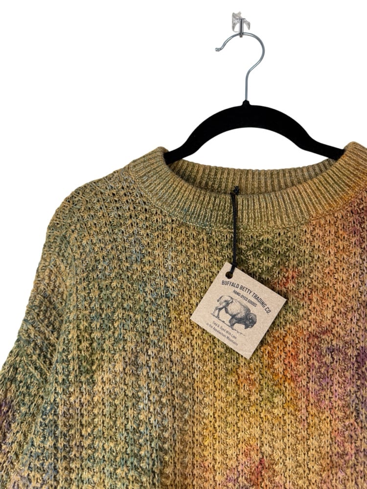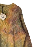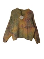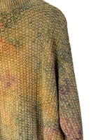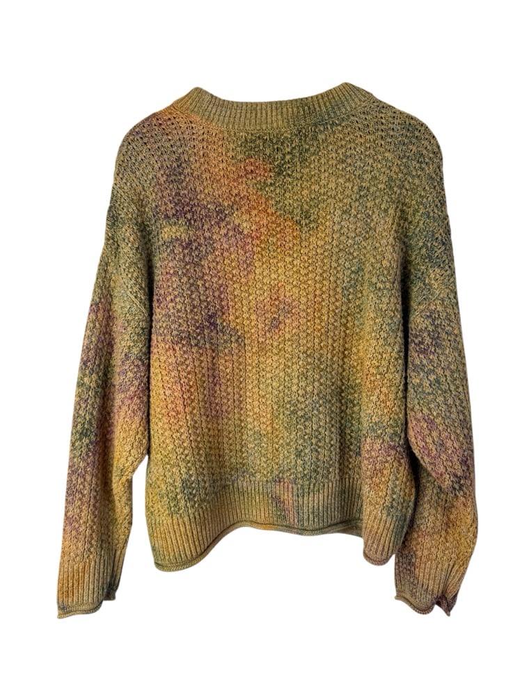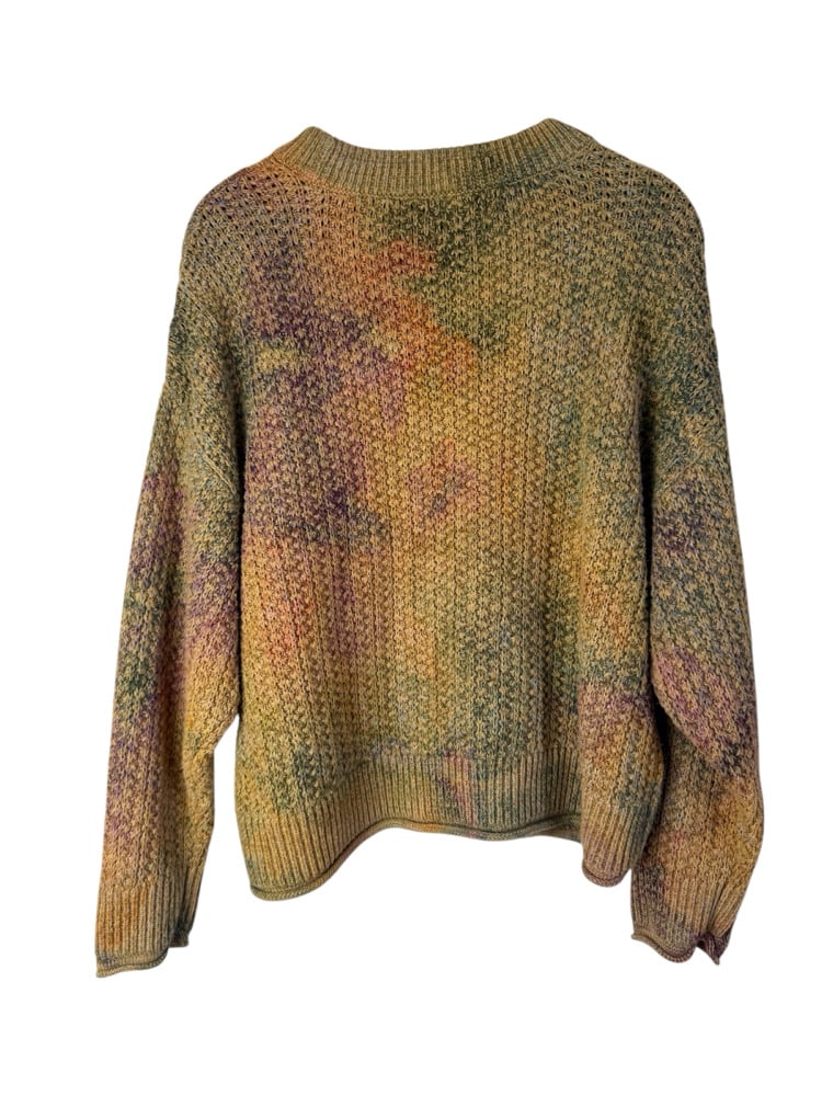 - Notes: Originally a yellow sweater that I overdyed, and interestingly, only some of the fibers dyes, leaving a very cool and muted tie-dye design.