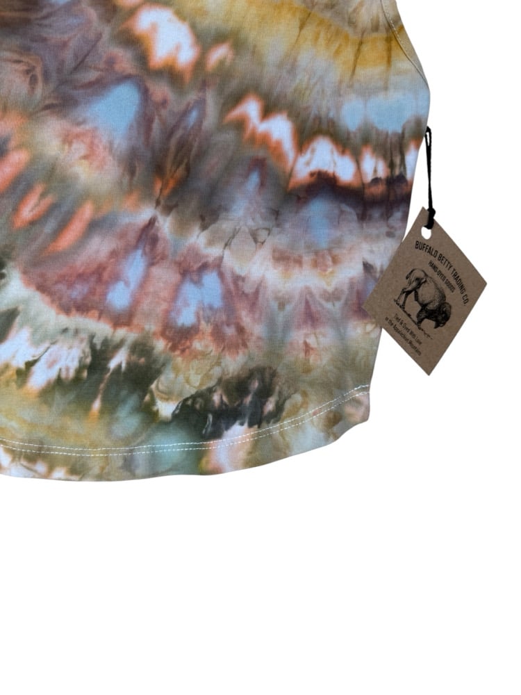 Each Buffalo Betty Trading Co. piece is completely one-of-a-kind. I dye everything by hand in small batches in my tiny home studio in the heart of the Appalachian Mountains. I mix the colors I use by hand and often create unique custom colors that can’t be reproduced. I utilize both traditional and modern methods and tie-dye techniques such as shibori and rain-dyeing